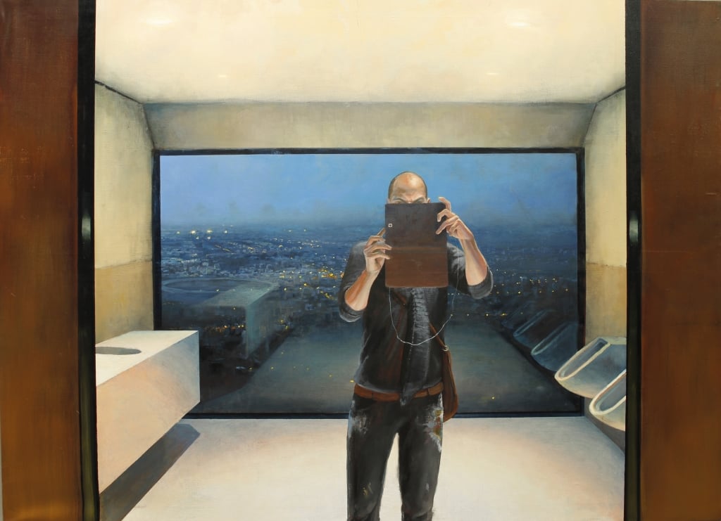 This painting always makes me smile a little, and gives me slight vertigo when I photograph it - frames within frames, bald heads and self portraits... The study for this painting was called 'As far as inflight break ups go, atleast it wasn't the airframe' - these paintings were created after I returned from Africa with a broken ankle and I couldn't get outside to paint and gather inspiration. The only place i continually found myself which I was inspired by - was the bathroom - If you saw the original exhibition you'll know the full story (feel free to email and ask). Hence a commencement of many lovingly painted urinals. This one in particular is the bathroom at Sofitel 35 - the view has since been half taken over by a sky skyscraper... There is some amazing brushwork in this image, I'll upload some more details soon.
